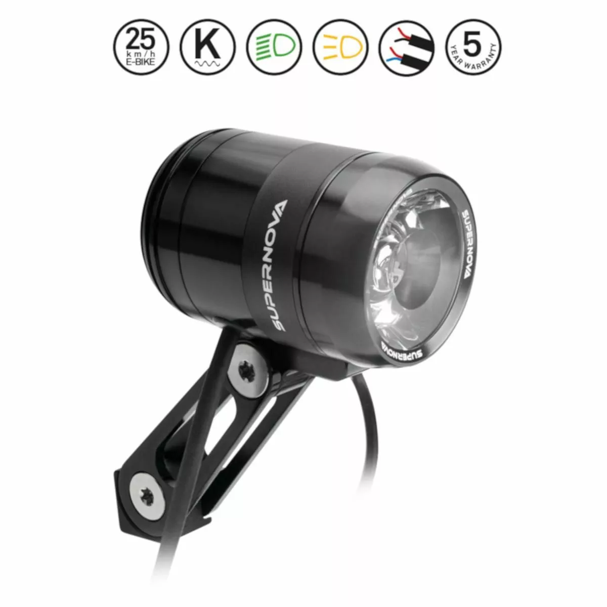 Das neue Supernova V1280 E-Bike 25 Frontlicht ist nicht nur kleiner und leichter als sein Vorgänger, sondern auch leistungsstärker. Mit seinen satten 260 Lumen, ist der V1280 Frontscheinwerfer einer der stärksten auf dem Markt und bringt somit ordentlich Licht ins Dunkle. Beste Sichtbarkeit im Straßenverkehr, garantiert das integrierte Tagfahrlicht sowie das seitlich strahlende Supernova Logo. Dieses kleine Kraftpaket arbeitet mit einer Spannung von 12-80 V und kann an fast jedes E-Bike angeschlossen werden. Zudem kommt der Scheinwerfer mit einem speziellen 12 V Anschluss für Supernova Rücklichter daher. Bedient wird der Scheinwerfer entweder über die Steuerung des E-Bikes oder über einen Taster am Scheinwerfer selbst.