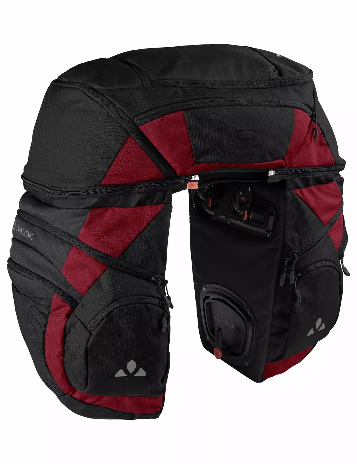 Die Vaude Karakorum Pro Hinterradtaschen sind auf ausgedehnte Trekking Touren mit viel Gepäck ausgelegt. Das 3-teilige Set besteht aus zwei geräumigen Gepäckträgertaschen und einem Top Case Aufsatz, welche insgesamt 68 Liter Fassungsvolumen zur Verfügung stellen. Das TopCase kann man nach Bedarf per Reißverschluss abnehmen und als Rucksack verwenden. Des Weiteren besitzt es ein Rückenpolster und ist sehr angenehm zu tragen. Ob das Gepäck für den langen Ausflug, Proviant für das Picknick im Grünen oder der Einkauf vom Supermarkt, die Karakorum Pro Hinterradtasche bietet vielseitige Einsatzmöglichkeiten. Zusätzlich sind mehrere Reflektoren an den Außenseiten angebracht, damit sie bei Nacht für andere Straßenteilnehmer immer gut zu sichtbar sind! Die Tasche ist „Made in Germany“ und PVC-frei produziert, was sie zu einem umweltfreundlichen Begleiter macht.